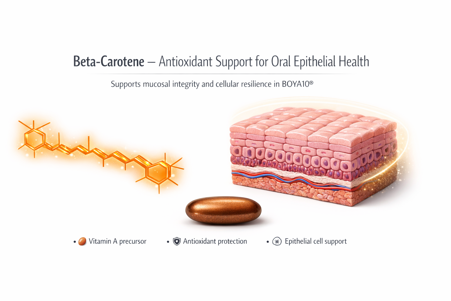 IN BOYA10, BETA-CAROTENE WORKS SYNERGISTICALLY WITH OTHER ANTIOXIDANTS TO STRENGTHEN ORAL TISSUE DEFENCE.